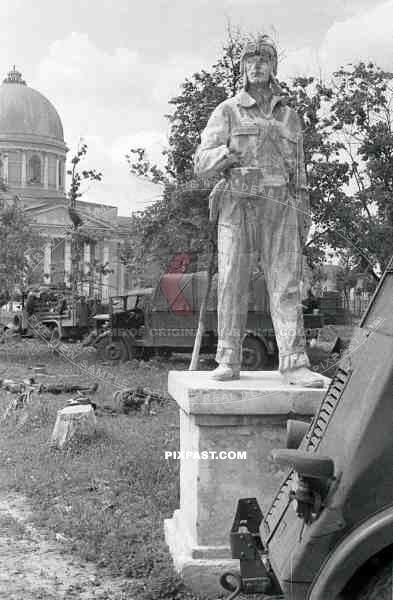 BW Russia Soviet Russian tank soldier statue monument captured french truck notek