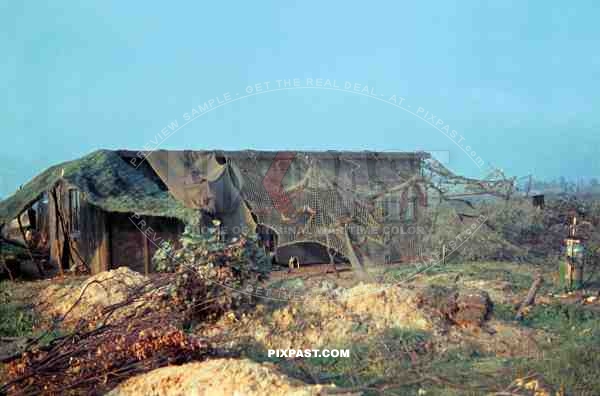 Camouflaged French makeshift airstrip officers mess. France 1940