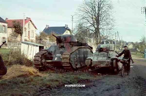 Captured Char B1 French heavy tank DROUOT with a camouflage FCM 36 Char leger Modele 1936 light infantry Tank. No.30036 GALIENI