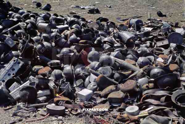 Captured French army helmets and military personnel equipment near French Coast France 1940.