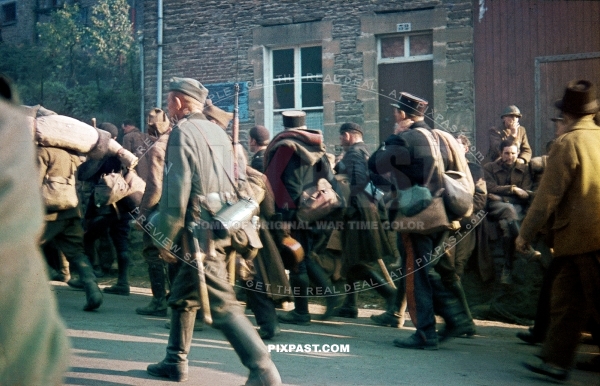 Captured French Military POW soldiers and military police men escorted back to German border. Belgium 1940