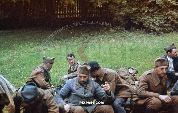 Captured French Military POW soldiers and military police men escorted back to German border. Belgium 1940