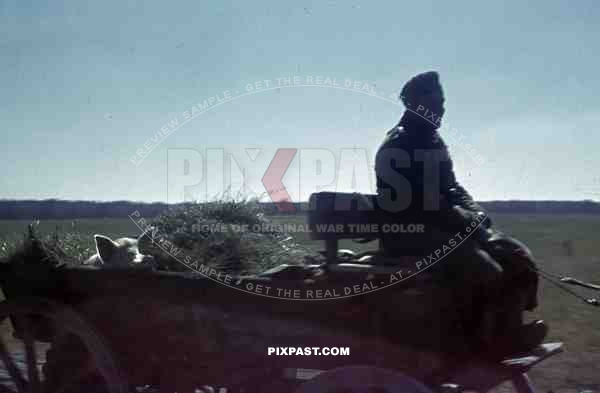 captured pig on the back of a horse cart, Russia 1944
