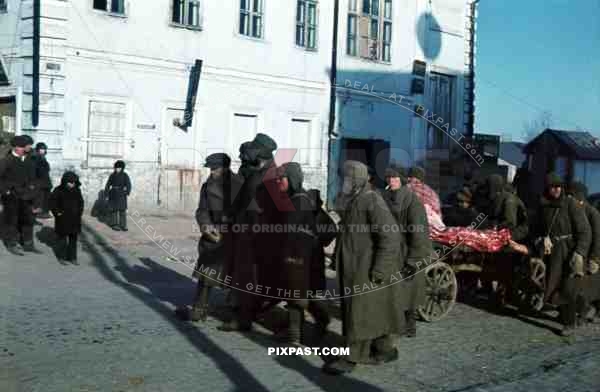 Captured Russian army prisoners pull meat wagon, Ochtyrka, Ukraine, Winter 1941, 94. Infantry Division,