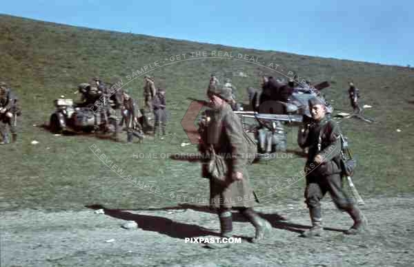 Captured Russian Prisoners of war walking past motor bike, Sd. Kfz. 247 Reconnaissance Armoured Car, Crimea, 1942