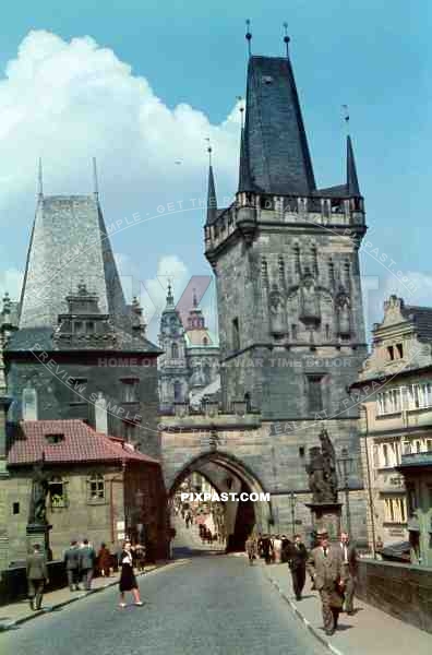 Charles Bridge crossing the Vltava river in Prague, Czech Republic 1940. Malostranska mostecka vez.