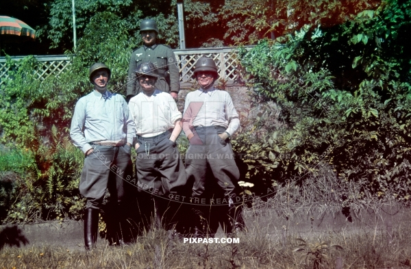 Cheeky German Wehrmacht officers wearing captured French and British steel battle helmets. France 1940.