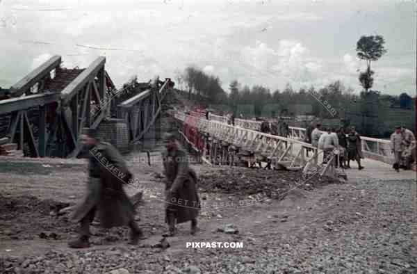 construction of a wooden bridge next to a broken rail bridge near Belgrade, Serbia ~1941
