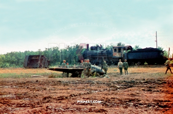 Crashed Russian fighter plane YAK 9 in front of blown up and burned Russian train. Russia 1940. 297 Infantry Division