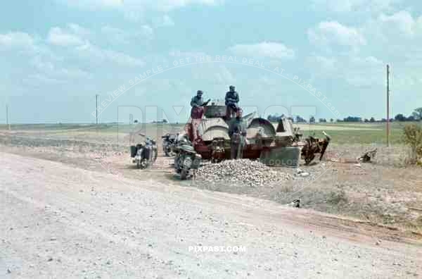 Destroyed German Horch 901 staff car beside Russian captured tank. German motor Despatch rider Kradmelder Russia 1941.