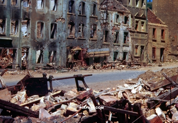 Destroyed German RSO Raupenschlepper tractor in heavily bombed Belgium town 1944