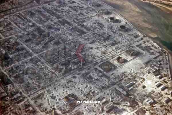 aerial view of the destroyed refinery in Waki, Japan 1945