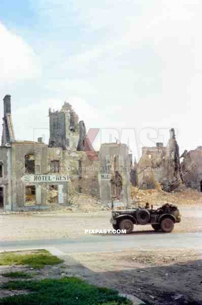 Dodge WC-57 Command Car. Church Ruins St. Lo Normandy. 166th Signal Photographic Company June 1944