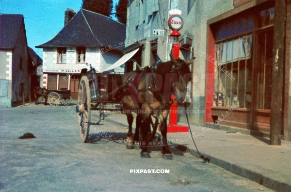 Farmers horse and wagon in front of French Esso petrol station in French village France 1940