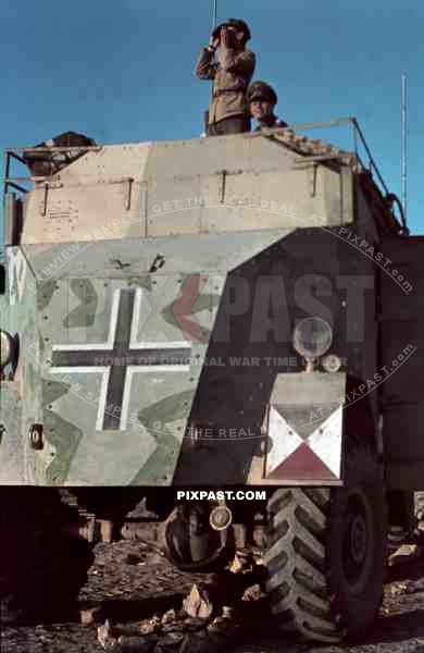 Field Marshal Erwin Rommel watching battlefield 1941 Tunisia in Captured British armoured truck MAX. MAMMUT