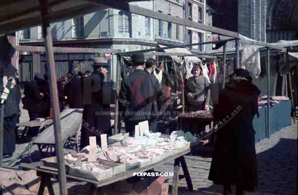 Food and Flea Market behind Notre Dame Cathedral, Paris, France, 1940.