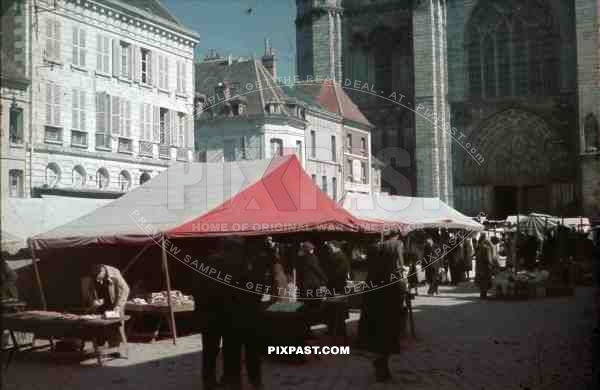 Food and Flea Market behind Notre Dame Cathedral, Paris, France, 1940. Place de la République,