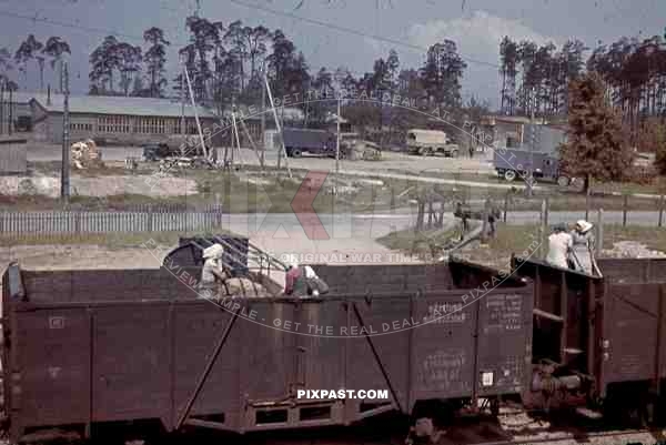 Forced labour, Finland, 1944, women loading German army trucks from train wagons, camo truck,