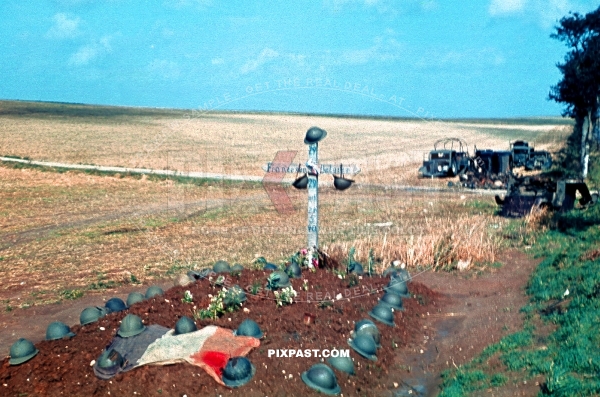 French helmets decorating a temporary war grave of fallen French soldiers beside Ambushed trucks. France 1940