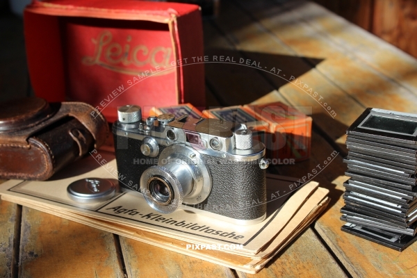 German 1934 Leica III camera with Elmar 5cm F3,5 lense. Original leather bag and Leica red box.