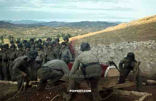 German Afrika Korp military Funeral in Tunisia 1942. Flag on coffin, Tropical uniform and helmet.