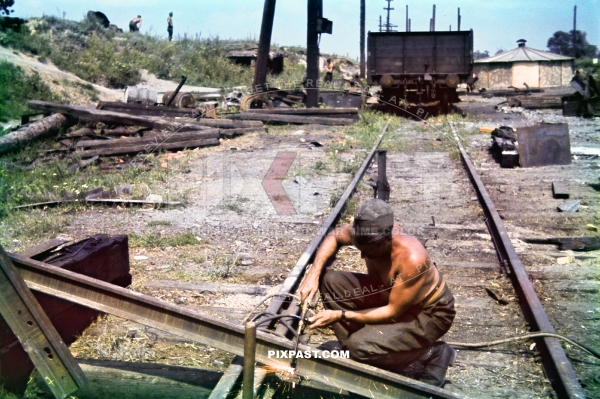 German army engineers repairing destroyed train tracks near Kharkov Ukraine 1942. 177. Division Kraftfahr Ersatz Battalion