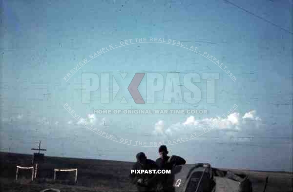 German army mechanics repair motorbike sidecar beside soldier grave, 10th Motorised infantry division Bryansk 1942