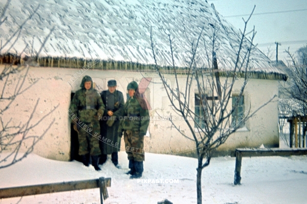 German army officers wearing camouflage uniforms in Ukraine village. Eastern front. Winter 1943.
