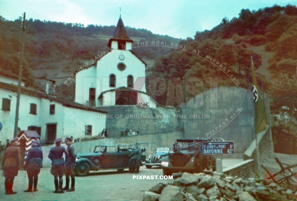 German army on the Spanish French border. Eglise de l Assomption in Arneguy spain border horch France 1940