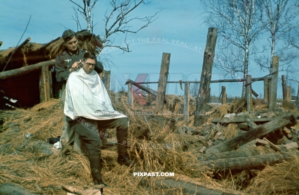 German army soldier getting his hair cut from field hard dressers. Beside destroyed farm house. Russia 1942
