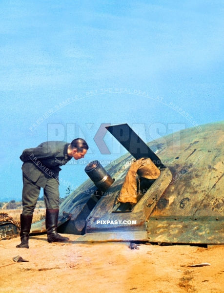 German army soldier inspecting captured French Maginot Bunker cannon in France 1940. Occupation. Blitzkrieg.