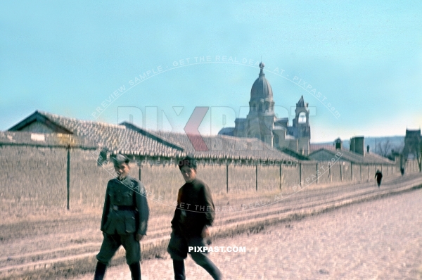 German army soldier walking with Russian Cossack in uniform and boots. Ukraine village 1942