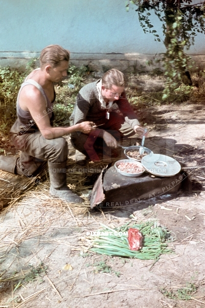 German army soldiers cooking vegetables and meat in the field. Russia 1942. 297 Infantry Division