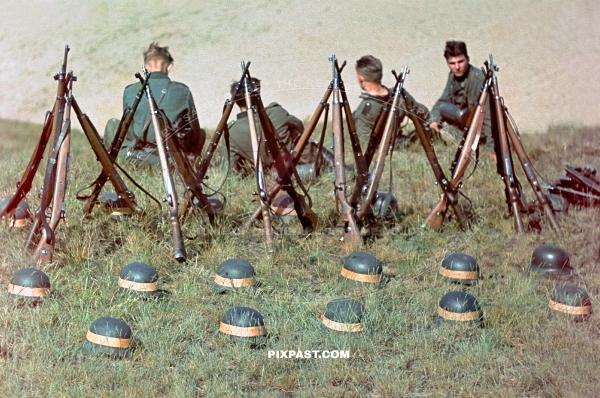 German army soldiers training with Kar98 rifles and yellow rubber band helmets. 8th Panzer Division. Russia August 1942
