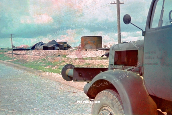 German army truck beside bombed oil storage tanks near Sea of Asov Ukraine 1942
