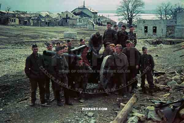 German artillery crew with Krim Shields pose beside blown up 10.5 cm leFH 18 Howitzer in Sevastopol 1942