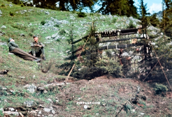 German Gebirgsjager resting beside central radio telephone FUNKER station hidden between the trees 1940