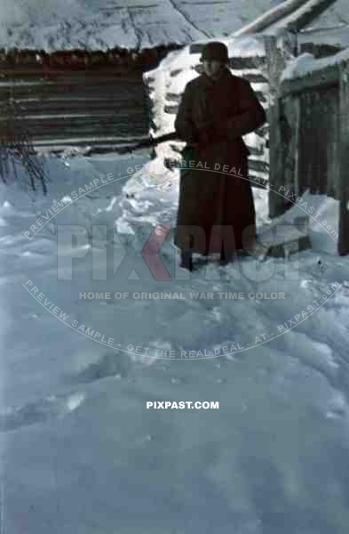 German guard sentry winter jacket mantel helmet stahlhelm m40 and kar98 rifle in Russian winter snow 1944