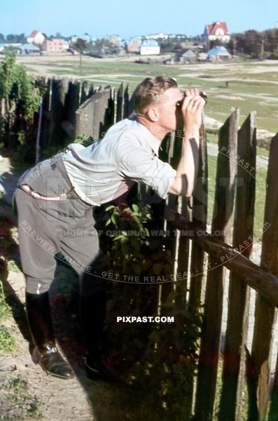 German infantry officer using his field binoculars in France 1940. 297 Infantry Division.