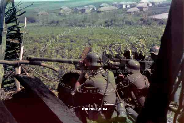 German infantry with 50mm PAK cannon targets Russian village, Southern Russia 1942 near Stalingrad area.