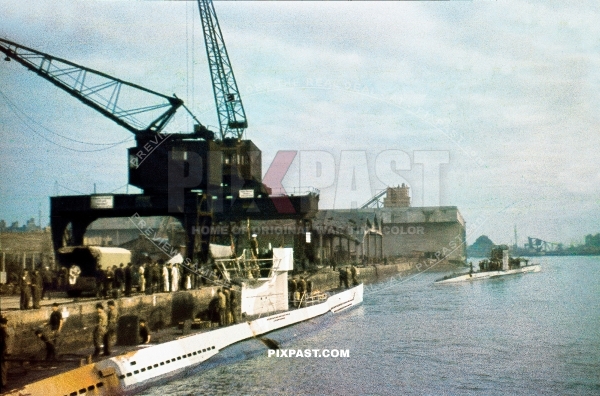German Kriegsmarine Uboat Submarine reloading supplies on the dock of Saint Nazaire sub base France 1942