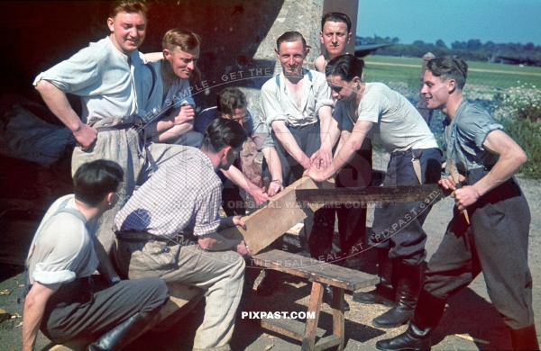 German Luftwaffe air force soldiers cutting wood with long timber saw. Bomber plane Air field. France 1940