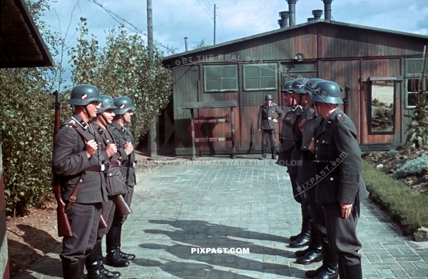 German Luftwaffe air force soldiers parade with Kar98 rifles at security station for RAD bridge repair unit. France 1940