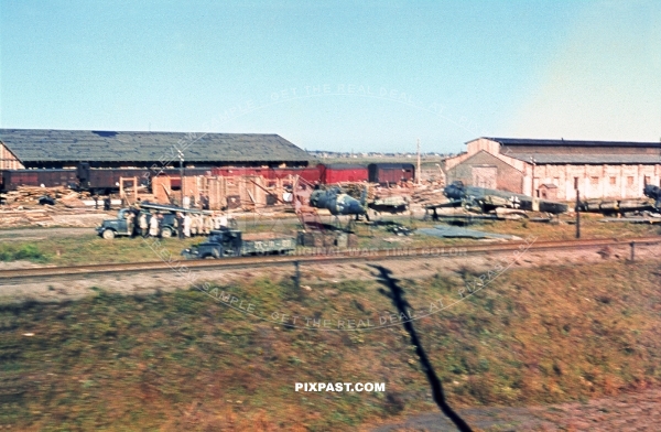 German Luftwaffe air plane repair workshop beside the train lines. Poland 1944 Bomber planes and wing parts being repaired