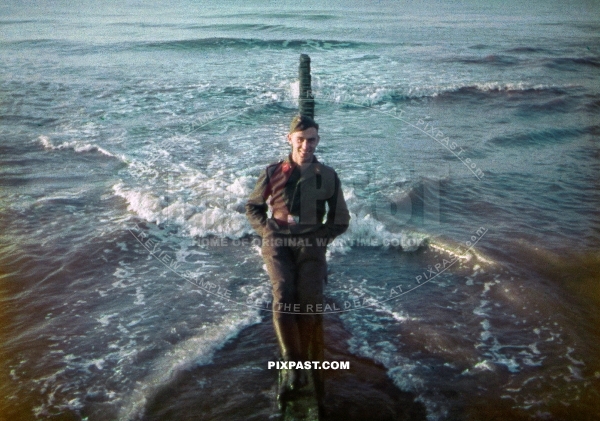 German Luftwaffe Flak soldier resting in English Channel. Normandy beach France 1940