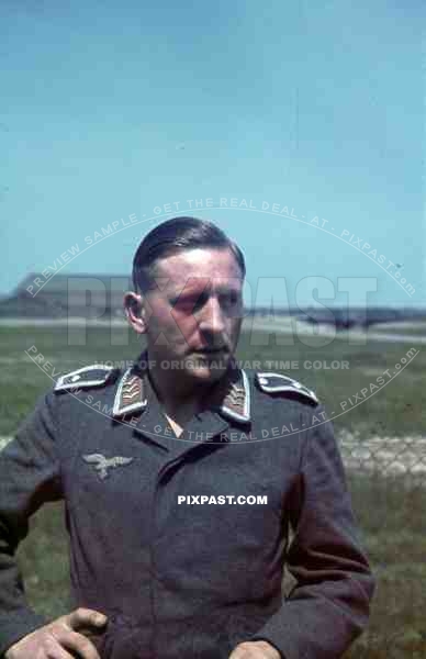 German Luftwaffe Ground Crew summer 1941 airbase with landing aircraft, portrait.
