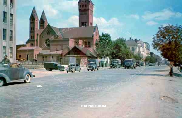 German Luftwaffe unit Luftlotte 2 drive past the Red Church / Church of Saints Simon and Helena in Minsk Belarus 1941.