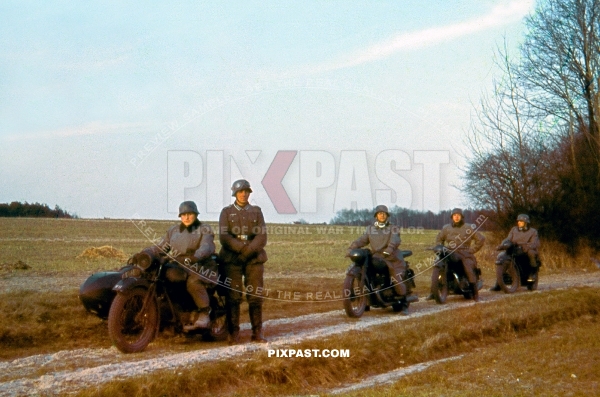 German motorbike messengers Kradmelder resting on dirt road. France 1940