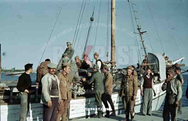 German mountain troops Gebirgsjager loading supplies onto small Greek fishing boat. Greek soldiers Greece 1942