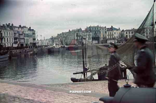 German officers with staff car inspect area in La Rochelle Harbour, France 1940. 4th Panzer Division.